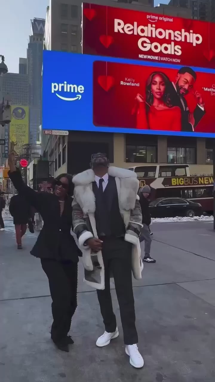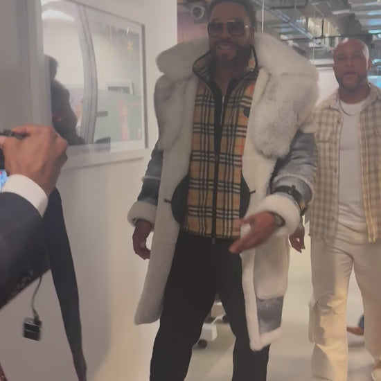 Crafted in premium shearling with a dramatic oversized fox fur collar, this men’s outerwear piece is designed for impact, warmth, and undeniable authority. The contrast of icy white fox against cool grey shearling delivers a refined yet powerful silhouette, while the structured leather accents and plush cuffs elevate the craftsmanship.